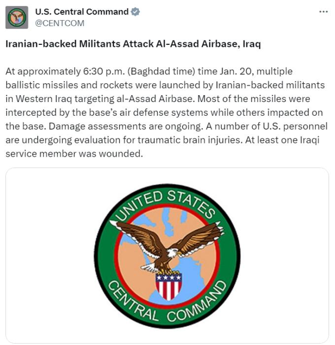 聲明表示,一些美軍人員正在接受腦外傷評估,襲擊還造成至少一名伊拉克軍人受傷。