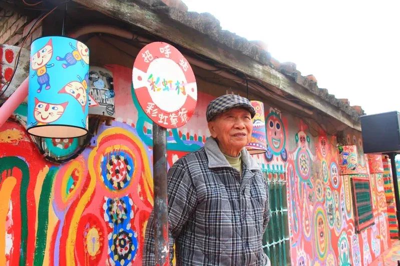 2008年,不舍于老舊眷村拆遷,沒有美術(shù)背景的黃永阜對照報紙副刊上的圖畫照片,開始在住家及鄰近房舍墻上、地面以油漆作畫,創(chuàng)作了許多生動逗趣的人物和動物形象,五彩繽紛、充滿童趣的畫風(fēng)讓眷村增添了生機(jī),并引起外界關(guān)注,多彩的村子遂被稱為“彩虹眷村”,黃永阜也收獲“彩虹爺爺”稱號。最終,在各方人士奔走爭取下,彩虹眷村被保留了下來。