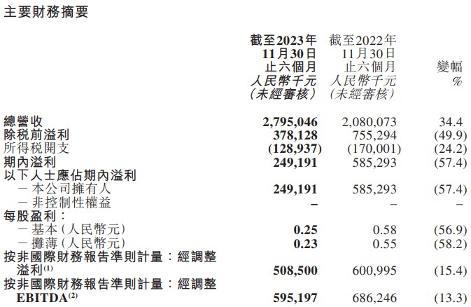1月24日晚間,東方甄選公布的財(cái)報(bào)數(shù)據(jù)顯示,在截至2023年11月30日的六個(gè)月內(nèi),東方甄選總營(yíng)收27.95億元,同比增長(zhǎng)34.4%;凈利潤(rùn)2.49億元,同比下滑57.4%;經(jīng)調(diào)整凈利潤(rùn)為5.95億元,同比下滑13.3%。