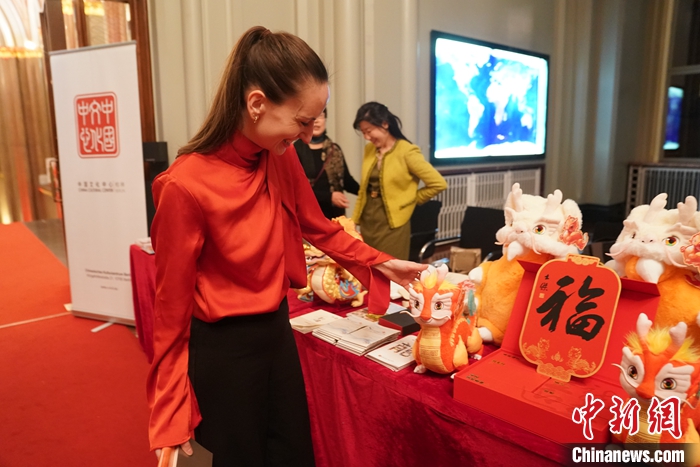 柏林中國(guó)文化中心還在現(xiàn)場(chǎng)設(shè)置了文化展臺(tái),向來(lái)賓展示來(lái)自中國(guó)的精美文創(chuàng)藝術(shù)品和文化旅游推廣品,龍年的“吉祥龍”深受來(lái)賓喜愛(ài)。