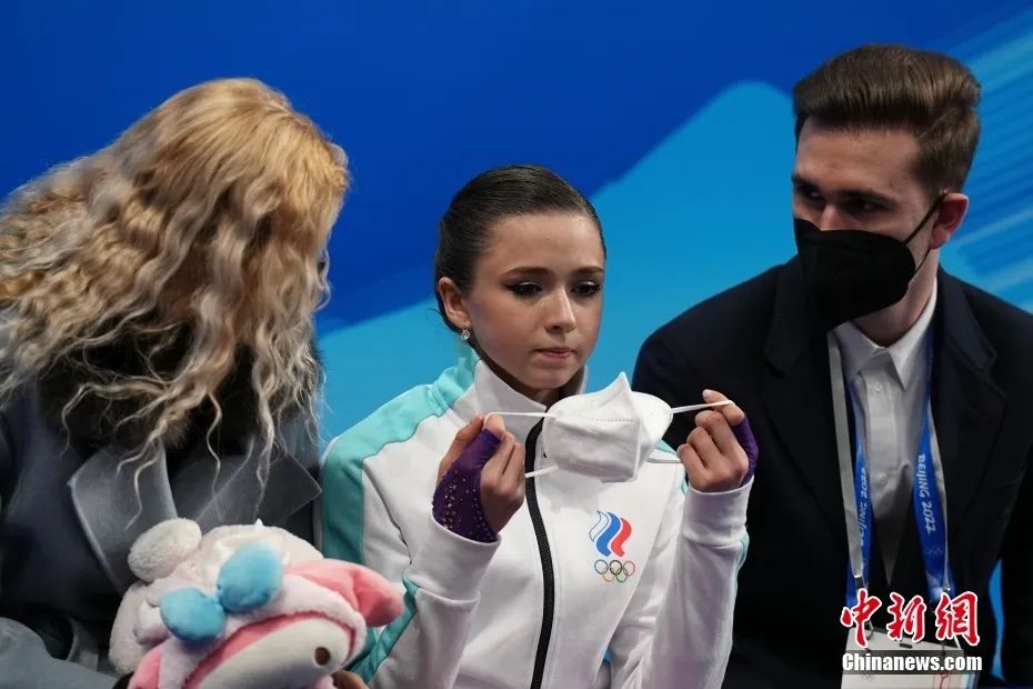 瓦利耶娃(中)在北京冬奧會比賽結束后等待分數(shù) 資料圖 中新社記者 崔楠 攝
