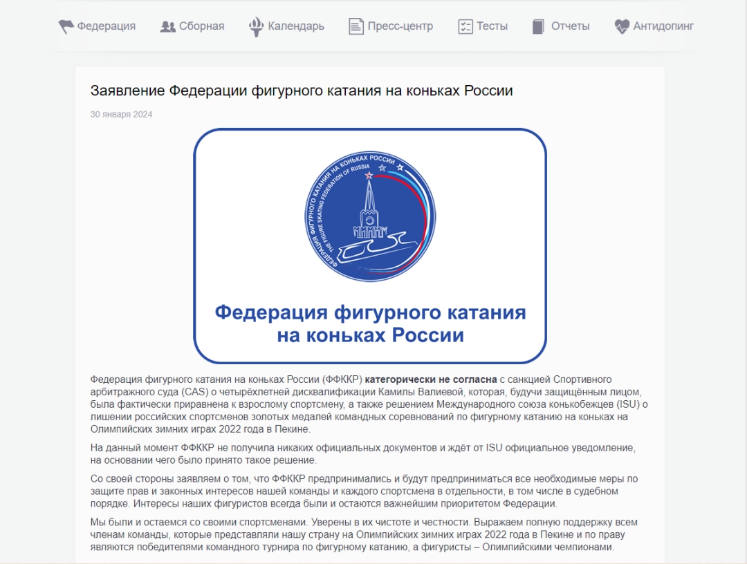 當?shù)貢r間1月30日,俄羅斯花樣滑冰聯(lián)合會(FFKKR)發(fā)布聲明表示,團隊中運動員的誠信無可挑剔,“堅決不同意國際體育仲裁法庭對卡米拉·瓦利耶娃的處罰”。