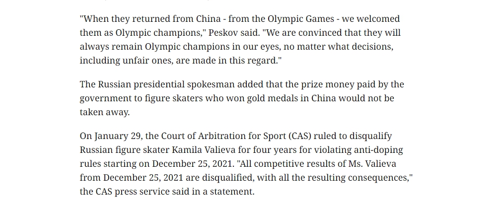 據(jù)塔斯社報道,佩斯科夫表示,無論國際體育組織作出什么決定,俄羅斯人會永遠將卡米拉·瓦利耶娃和其他花樣滑冰運動員視為冬奧冠軍。