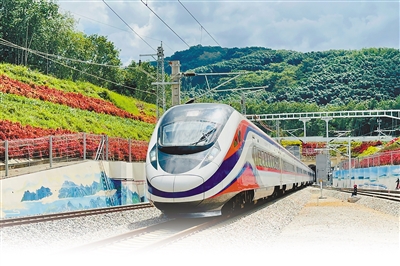 “瀾滄號(hào)”動(dòng)車組從中老鐵路友誼隧道穿行而過(guò)。