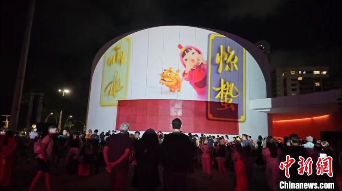 當(dāng)天晚上,多娜·琳杜公園內(nèi)劇院的外墻,投影出中國(guó)文化元素?zé)艄庑恪.?huà)面中,十二個(gè)生肖福娃次第給觀眾拜年,中國(guó)傳統(tǒng)時(shí)令節(jié)氣習(xí)俗一一展演,格外吸睛。