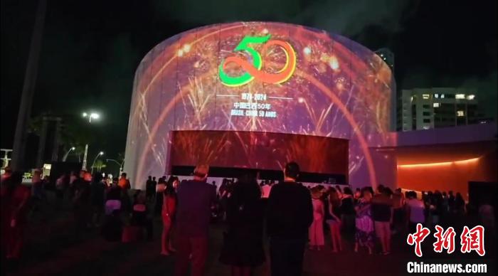 2月3日晚間,累西腓燈光秀匯演活動(dòng)中展示了中巴建交50周年的紀(jì)念標(biāo)志。曹璇攝