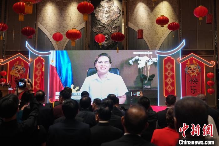 2月2日,中國(guó)駐菲律賓大使館在馬尼拉舉辦龍年新春招待會(huì)。圖為菲律賓副總統(tǒng)莎拉視頻致辭。中新社記者 張興龍 攝