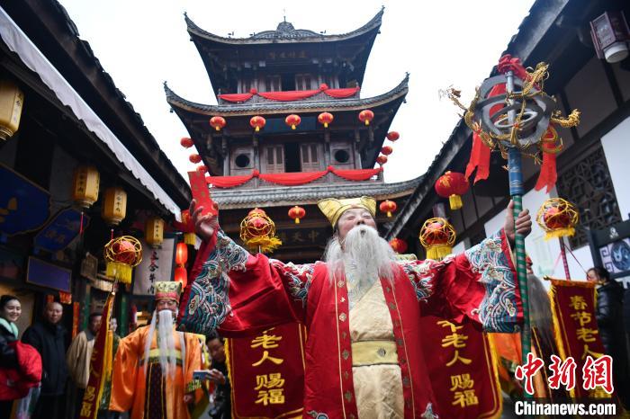 中新網(wǎng)閬中2月4日電 題:走進春節(jié)文化之鄉(xiāng):春倌說春迎新年 春節(jié)老人賜福忙