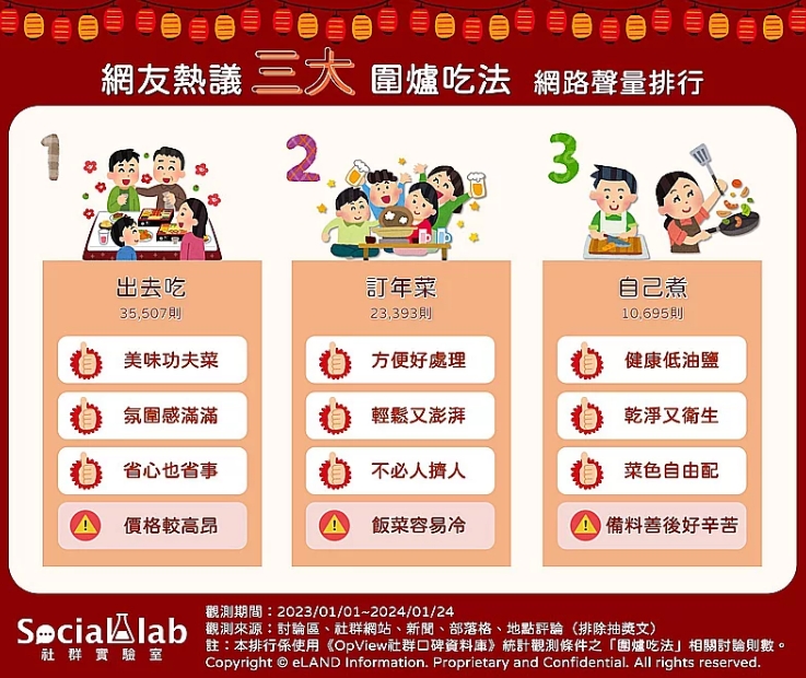 農(nóng)歷新年即將到來,而重頭戲之一便是除夕時(shí)端上桌的年夜飯!觀察近一年臺(tái)灣網(wǎng)友針對(duì)“圍爐吃法”相關(guān)話題的討論,可以發(fā)現(xiàn)近年不少人為了避免自行下廚的繁復(fù)工程,紛紛選擇在除夕時(shí)出去吃年夜飯,只需一通電話預(yù)約,即可輕松享用美味的菜肴,省心又省事。