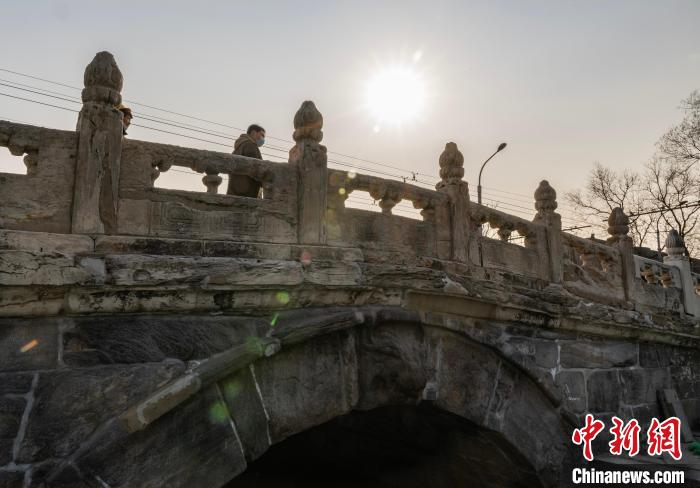 2023年2月22日,位于北京市西城區(qū)的“北京中軸線第一橋”——萬(wàn)寧橋映襯在陽(yáng)光之下。萬(wàn)寧橋始建于元代,為單孔石拱橋,橫跨在什剎海前海東岸的玉河上,西鄰什剎海前海,是《北京中軸線保護(hù)管理規(guī)劃(2022年—2035年)》確定的遺產(chǎn)區(qū)要素之一。中新社記者侯宇攝