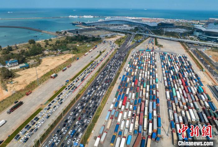 2月5日海口新海港,貨車排隊等待裝船。中新網(wǎng)記者駱云飛攝