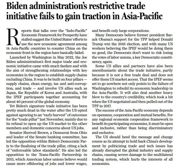 然而,去年11月,受到美國方面態(tài)度的影響,框架“四大支柱”中的“貿(mào)易支柱”談判未能收獲“早期成果”。這主要是因?yàn)槊绹芙^向其他成員國開放市場(chǎng),且其國內(nèi)擔(dān)憂協(xié)定可能會(huì)給就業(yè)帶來影響。由此,IPEF基本上已沒有前途可言。