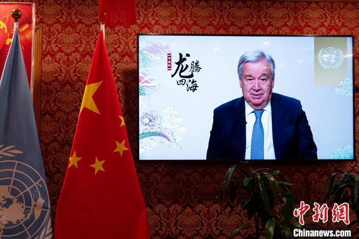 當(dāng)?shù)貢r(shí)間2月6日,聯(lián)合國(guó)秘書長(zhǎng)古特雷斯通過視頻發(fā)表新春致辭,向中國(guó)人民和全球華人致以農(nóng)歷甲辰龍年的祝福和問候。圖為中國(guó)常駐聯(lián)合國(guó)代表團(tuán)紐約駐地的屏幕播放致辭。 中新社記者 王帆 攝