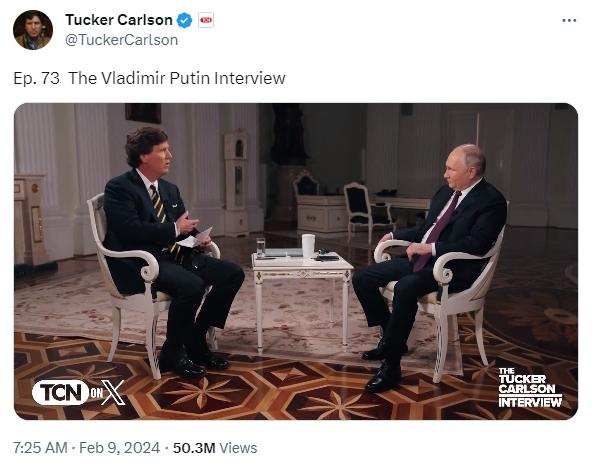 上線前,這場采訪就在世界范圍內(nèi)引發(fā)關(guān)注。有媒體稱,這次采訪或?qū)⒊蔀?022年烏克蘭危機爆發(fā)后,美國媒體人對普京進行的首個正式訪問。相關(guān)通告已在社交媒體上獲得了網(wǎng)友的上億次瀏覽量。