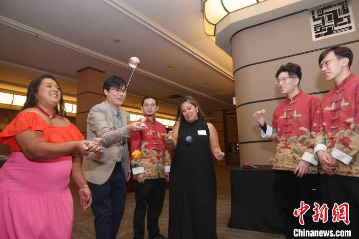 2月8日,曾在香港和國際賽事中屢獲殊榮的香港劍球(亦稱劍玉)隊(duì)成員(著唐裝者)獲香港駐多倫多經(jīng)貿(mào)處邀請(qǐng)?jiān)L加并出席新春酒會(huì)時(shí),指導(dǎo)與會(huì)嘉賓體驗(yàn)劍球?!≈行律缬浾?余瑞冬 攝