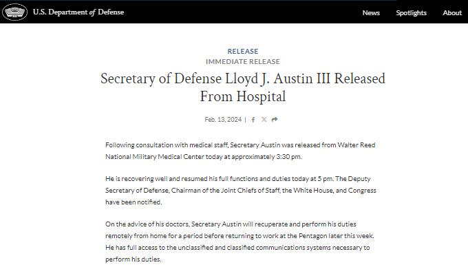 聲明稱,經(jīng)過與醫(yī)務(wù)人員協(xié)商后,奧斯汀于13日下午3時(shí)30分左右出院。他恢復(fù)良好,并于當(dāng)日下午5時(shí)恢復(fù)了全部職能和職責(zé)。