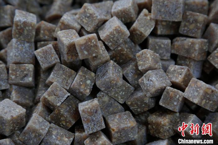 晉祠桂花元宵,餡料是靈魂。傳統(tǒng)晉祠桂花元宵的餡料需要將核桃、芝麻、花生翻炒去皮后,再把糖稀加熱化開,加入白糖、冰糖、純天然玫瑰花醬和桂花醬翻炒,炒制完成后放入模子壓實(shí)搟平,晾曬切塊。