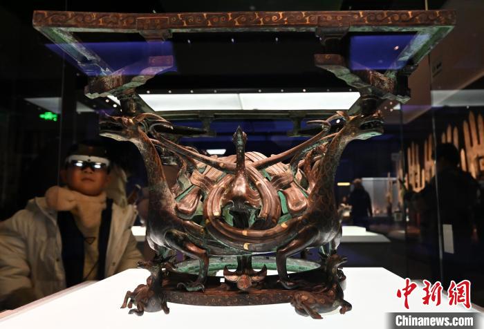 因年代久遠(yuǎn),錯(cuò)金銀四龍四鳳銅方案座的案面已朽,但案座依然十分精美。 中新社記者 翟羽佳 攝