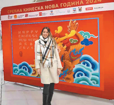 1月30日,在塞爾維亞諾維薩德,一位女士在“歡樂(lè)春節(jié)”活動(dòng)展板前留影。