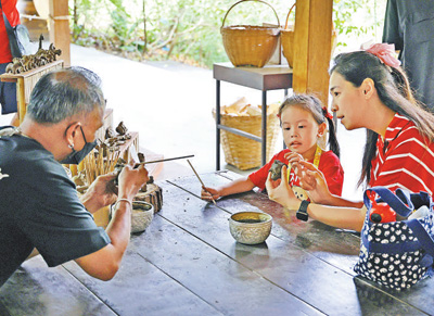 在曼谷桑普蘭濱江園有機農(nóng)場內,游客體驗泰國傳統(tǒng)泥塑手工藝。
