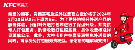 肯德基官網(wǎng)顯示,肯德基宅急送外送費(fèi)官方定價(jià)將于2024年2月20日從9元下調(diào)為6元。同時(shí),肯德基稱,為了更好地提升外送產(chǎn)品的服務(wù)體驗(yàn),對(duì)外送打包袋進(jìn)行了保溫升級(jí),并提供專人打包服務(wù),酌情收取打包服務(wù)費(fèi)。此外,大神卡用戶在享受滿額免外送費(fèi)的同時(shí),可享受免打包服務(wù)費(fèi)權(quán)益。