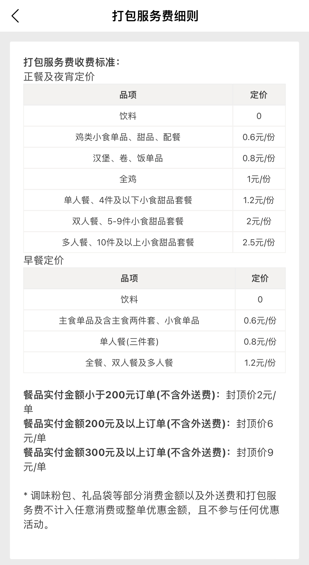 肯德基公布細(xì)則顯示,正餐及夜宵方面,雞類小食單品、甜品、配餐打包服務(wù)費(fèi)為0.6元/份,漢堡、卷、飯單品打包服務(wù)費(fèi)為0.8元/份,全雞打包服務(wù)費(fèi)為1元/份,單人餐、4件及以下小食甜品套餐打包服務(wù)費(fèi)為1.2元/份,雙人餐、5-9件小食甜品套餐打包服務(wù)費(fèi)為2元/份,多人餐、10件及以上小食甜品套餐打包服務(wù)費(fèi)為2.5元/份,飲料則不收打包服務(wù)費(fèi)。