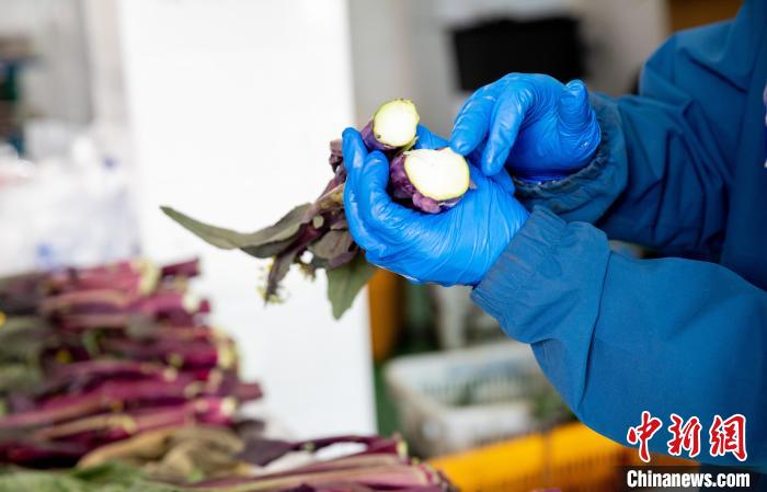 每天清早,趁露水未干,菜農(nóng)便穿梭于田壟間,長勢繁茂的菜薹如女子手腕粗細,葉片紅得發(fā)紫。菜農(nóng)手握掐刀,瞄準(zhǔn)基部輕輕一掐,汁水四溢,拭塵土、扒外皮,即可生食。若是經(jīng)歷寒風(fēng)雪霜,更是甘甜。