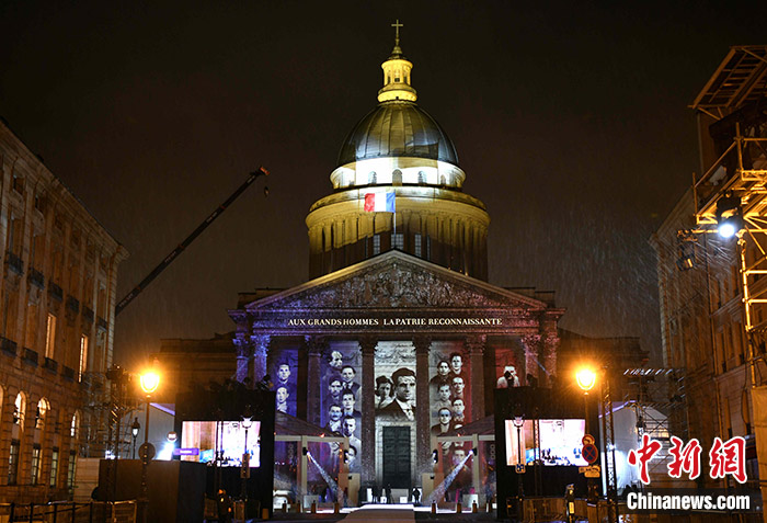 法國官方當晚舉行了莊嚴的靈柩遷葬儀式。記者在現(xiàn)場看到,盡管天氣惡劣,風雨交加,仍有眾多民眾冒雨守候在通往先賢祠的道路兩旁觀看儀式。馬努尚夫婦和抵抗納粹小組成員的照片被投射到先賢祠的正門上。