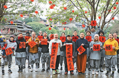 春節(jié)期間,廣西壯族自治區(qū)桂林市靈川縣九屋鎮(zhèn)西嶺山莊迎來一批外國客人,他們一起寫福字、磨豆腐、舂糍粑、釀圓子……沉浸式體驗中國傳統(tǒng)民俗,現(xiàn)場歡聲笑語不斷。