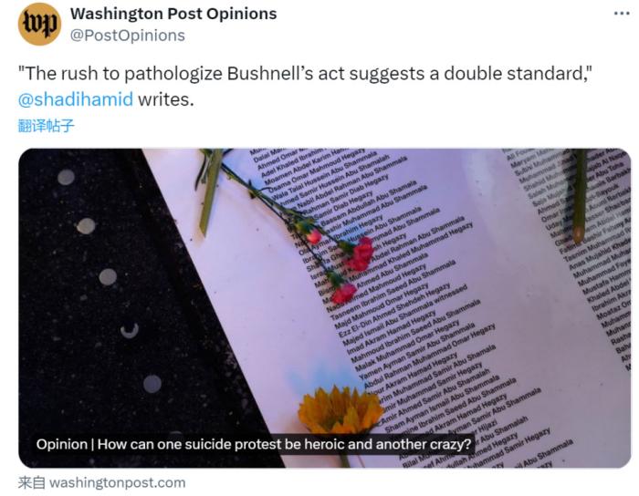 要知道,去年12月就已經(jīng)有美國人在以色列駐亞特蘭大領(lǐng)事館門口,拿著巴勒斯坦國旗自焚抗議,而這位女士至今沒有報道提到過她的姓名。很可能布什內(nèi)爾這次事件的策劃,是吸取過亞特蘭大自焚案教訓的。即便如此,他也躲不過惡意的編排。
