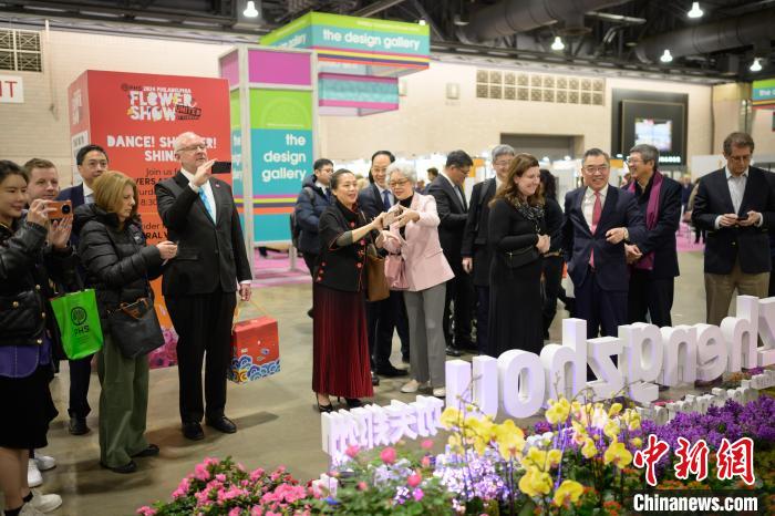 當?shù)貢r間3月2日,一年一度的費城花展在美國賓夕法尼亞州費城開幕,以“功夫鄭州——花俏嵩山”為主題的鄭州展園當天在花展上亮相。圖為中國駐紐約總領事黃屏(右三)帶領嘉賓參觀鄭州展園?!ranck Zhou 攝