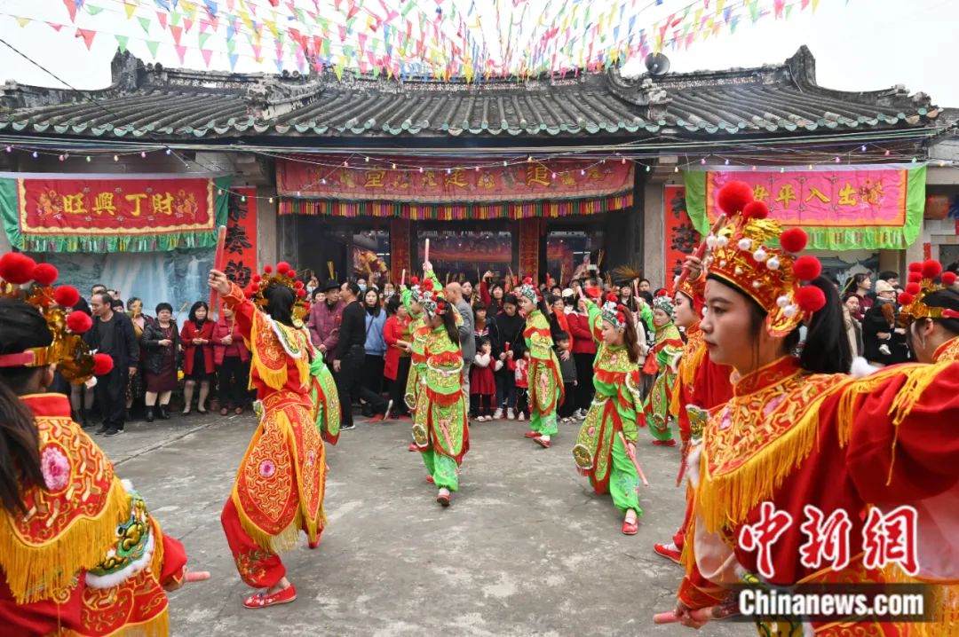 2024年2月20日,廣東潮州溪美寨村舉行傳統(tǒng)游神民俗活動(dòng),巡游隊(duì)伍的英歌舞表演吸引民眾觀看。陳楚紅 攝