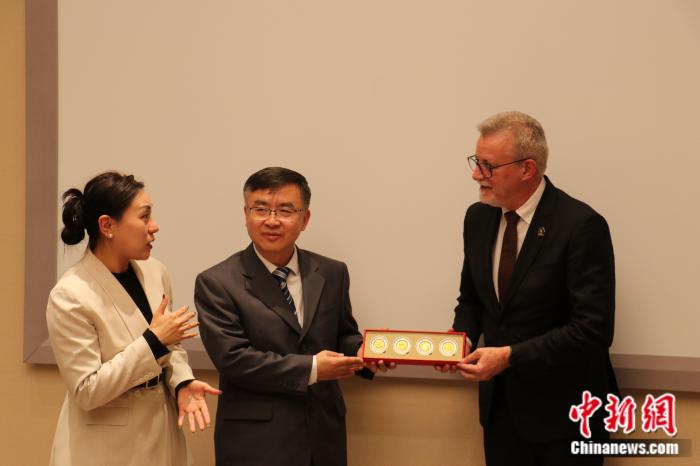 中國社會(huì)科學(xué)院領(lǐng)導(dǎo)與巴西坎皮納斯州立大學(xué)校長(zhǎng)互換禮物。 中新網(wǎng)黃方 攝