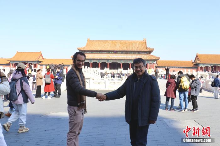 巴西坎皮納斯州立大學(xué)孔子學(xué)院中方院長(zhǎng)高沁翔教授與孔子學(xué)院巴方院長(zhǎng)布魯諾·孔蒂(Bruno Martarello de Conti)在故宮握手合影。 中新網(wǎng)黃方 攝