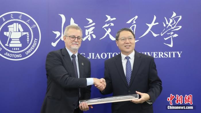 北京交通大學(xué)校長(zhǎng)余祖俊和巴西坎皮納斯州立大學(xué)校長(zhǎng)安東尼奧·梅雷萊斯(Antonio José de Almeida Meirelles)互贈(zèng)禮物。 中新網(wǎng)吳家駒 攝