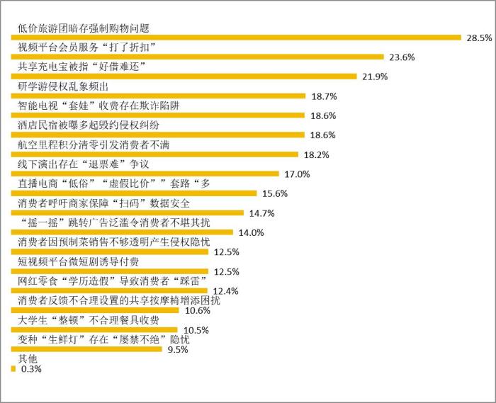 中新網(wǎng)3月14日電(中新財(cái)經(jīng)記者 謝藝觀)3月14日,中國消費(fèi)者協(xié)會(huì)對(duì)外發(fā)布2024年“激發(fā)消費(fèi)活力”消費(fèi)維權(quán)年主題調(diào)查報(bào)告,調(diào)查結(jié)果顯示,低價(jià)旅游團(tuán)暗存強(qiáng)制購物、視頻平臺(tái)會(huì)員服務(wù)“打了折扣”、共享充電寶“好借難還”引共鳴。