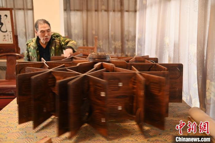 圖為梁寶寶展示畢生心血木雕作品《天地開寶照 日月風(fēng)水明》。李亞龍 攝