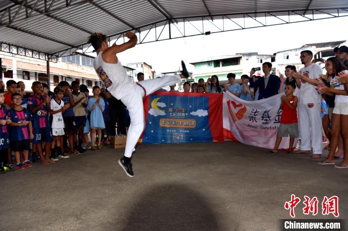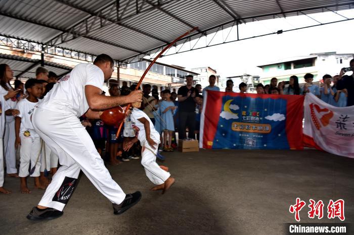 當(dāng)?shù)貢r間3月23日,巴西里約熱內(nèi)盧石頭河社區(qū),巴西“戰(zhàn)舞”舞者為來自加拿大的華僑華人小朋友表演。 中新社記者 林春茵 攝