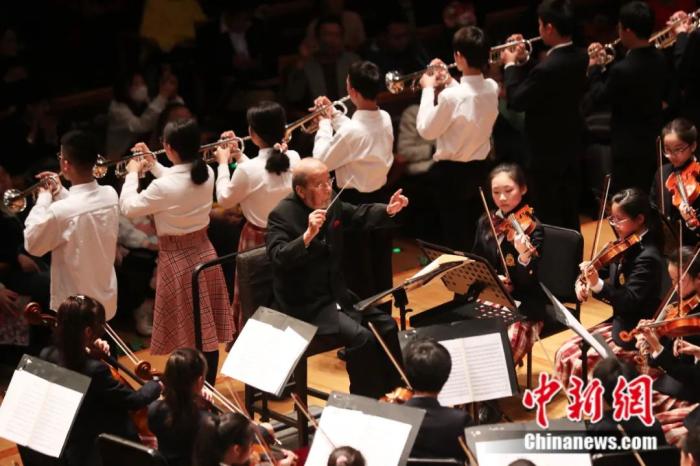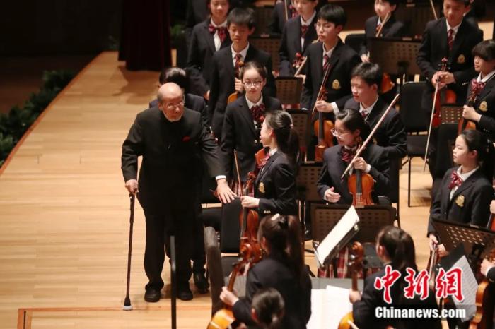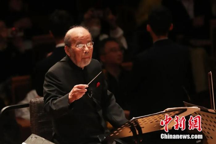 音樂會(huì)的尾聲,99歲高齡的中國(guó)著名指揮家曹鵬在長(zhǎng)達(dá)一分半的掌聲中登上指揮臺(tái)。