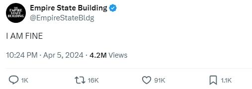 地震發(fā)生幾分鐘后,紐約地標建筑帝國大廈的官方社交媒體賬號發(fā)文稱:“我很好”。