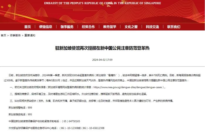 目前,新每周報告確診病例超300例,鑒于新登革熱傳統(tǒng)高發(fā)季節(jié)(每年5到10月)臨近,并且近期新加坡天氣炎熱,登革熱傳播風(fēng)險高企,駐新加坡使館提醒在新中國公民注意防范登革熱: