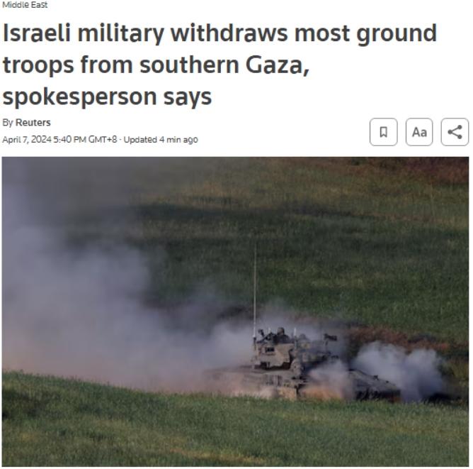中新網(wǎng)4月7日電 據(jù)路透社消息,當?shù)貢r間4月7日,以色列軍方發(fā)言人表示,以軍已從加沙地帶南部撤出幾乎所有地面部隊,僅留下一個旅的人員。