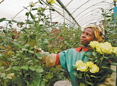 近年來(lái),鮮花是肯尼亞出口中國(guó)的主要農(nóng)產(chǎn)品之一。圖為在肯尼亞奈瓦沙湖畔的一家鮮花農(nóng)場(chǎng),一名花農(nóng)正在采摘鮮花。