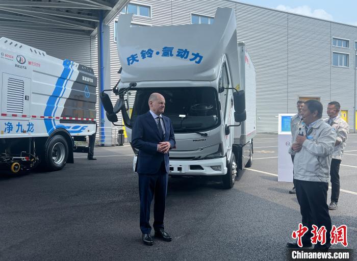 博世氫動(dòng)力系統(tǒng)(重慶)有限公司是朔爾茨訪渝首站參觀地。該公司由博世與慶鈴汽車合資建立,致力于將博世氫燃料電池解決方案引入中國市場。在參訪點(diǎn)入口,四輛冷鏈物流、環(huán)衛(wèi)及牽引車等依次停放。這些車全為中國國產(chǎn)汽車,使用博世氫動(dòng)力系統(tǒng)(重慶)有限公司出產(chǎn)的氫動(dòng)力模塊。朔爾茨在企業(yè)相關(guān)負(fù)責(zé)人的介紹下,了解博世與中企合作的最新成果。在工作人員指引下,朔爾茨為完成預(yù)裝的氫動(dòng)力模塊拴緊最后一顆螺絲,向身邊工作人員豎起了大拇指。