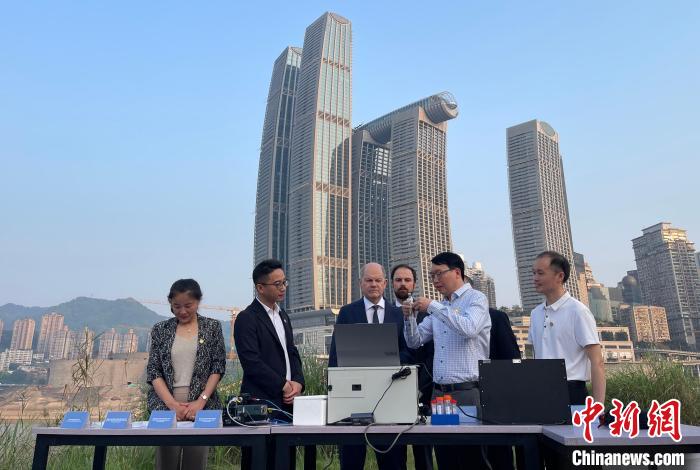 2019年,重慶大學(xué)智能生化傳感與精密儀器團(tuán)隊(duì)和德國庫特-施瓦伯測量與傳感器科技研究所,共同開展生態(tài)環(huán)境保護(hù)領(lǐng)域的水環(huán)境污染物高效檢測技術(shù)與裝備的研究開發(fā)。在長江和嘉陵江交匯處的江岸邊,該項(xiàng)目的重慶大學(xué)研究團(tuán)隊(duì)向朔爾茨介紹檢測儀器如何進(jìn)行水質(zhì)檢測與分析。朔爾茨將檢測樣品注入檢測儀后,查看了檢測結(jié)果。