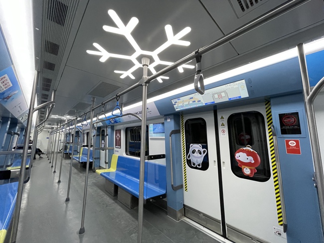 登上車廂,隨處可見冬奧元素。車頂?shù)臒魩Р辉賳握{(diào),而是被設(shè)計成了雪花的形狀,車廂扶手也融入了冰球桿的設(shè)計。而在車門上,北京冬奧會吉祥物“冰墩墩”和“雪容融”仿佛在和乘客們招手。