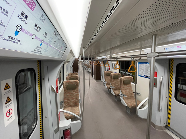 走進(jìn)車廂,記者注意到,車內(nèi)沒有用來隔絕駕駛室與客室的間壁門,而是采用開放式駕駛室,乘客可在保證安全的情況下更直觀地感受駕駛員的視角。此外,考慮到接駁大興機(jī)場線大件行李旅客的需求,“虎鯨號”列車設(shè)計(jì)2節(jié)“特別”車廂,車廂內(nèi)設(shè)置左右兩邊單列單座的高鐵同款座椅,乘客可將大件行李放在座位側(cè)邊,避免車廂內(nèi)擁擠。
