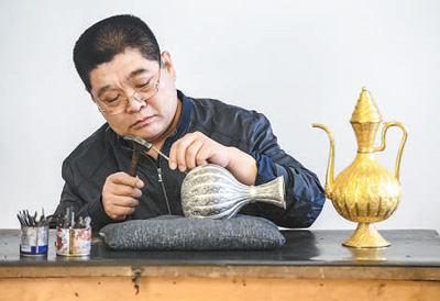 “花絲鑲嵌工藝是一項融合藝術(shù),集掐絲、鏨刻、鑲嵌等工藝為一體?!瘪R福良介紹,河北大廠花絲鑲嵌制作技藝的歷史可上溯到漢代,隨著歷史的發(fā)展,融合了多民族、多地域的技藝特點,形成了獨具特色的花絲工藝品。如今,大廠回族自治縣已成為我國北方地區(qū)花絲鑲嵌工藝品生產(chǎn)和出口基地。2008年,花絲鑲嵌制作技藝被列入國家級非物質(zhì)文化遺產(chǎn)名錄。2009年,馬福良成為這一項目的國家級代表性傳承人。