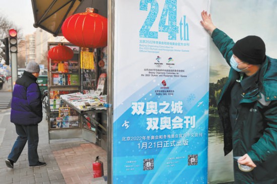 昨天上午,位于廣渠門內(nèi)大街富貴園購物中心前的郵政報刊亭旁,三位來自北京郵政的工作人員正忙碌著。很快,三張印有“雙奧之城,雙奧會刊”“北京2022年冬奧會和冬殘奧會官方中文會刊1月21日正式出版”等字樣的嶄新海報貼上了報刊亭的公益宣傳欄。以白色和藍色為主色調的主題海報剛剛貼好,就立刻吸引了過往路人的駐足觀看:“這海報真有冬奧氛圍?!薄岸瑠W會刊?到時候得來一份看看。”不少路人掏出手機,對著海報上的預訂二維碼現(xiàn)場掃碼,了解具體情況。