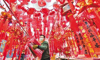 1月8日,石家莊市南三條市場的商戶在忙著準(zhǔn)備年貨。隨著農(nóng)歷新年的臨近,春聯(lián)、福字、燈籠、虎年生肖飾品的銷售行情逐日升溫。 河北日報通訊員 張曉峰攝